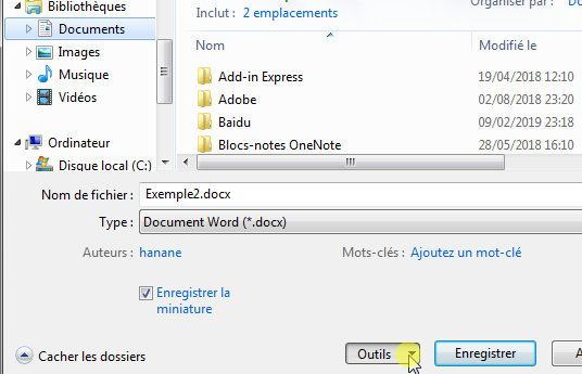 - La fenêtre « Enregistrer sous» s’ouvrira. Chiquez sur la flèche en regard du bouton « Outils » dans le coin inférieur droit :