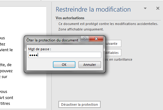 Si c’est vous qui aviez créé le document, vous connaissez donc le mot de passe utilisé pour restreindre les modifications. Cette situation est donc très simple et il sera facile d’ôter la protection et de modifier le document verrouillé.