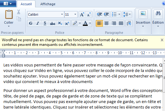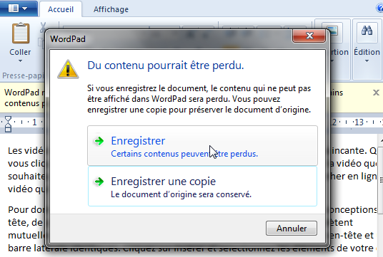 - Cliquez sur « Enregistrer» et « WordPad » vous affichera une petite fenêtre pour vous avertir que certains contenus peuvent être perdus. Cliquez sur « Enregistrer » pour continuer.