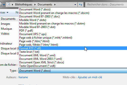 - Dans la boite de dialogue « Enregistrer sous» qui s’ouvre sélectionnez le format « *.rtf » dans le menu déroulant « Type » :