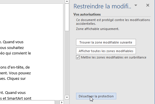 - Dans le volet « Restreindre la modification» qui s’affiche à droite de la fenêtre Word, cliquez sur « Désactiver la protection » et aucun mot de passe ne vous sera demandé :