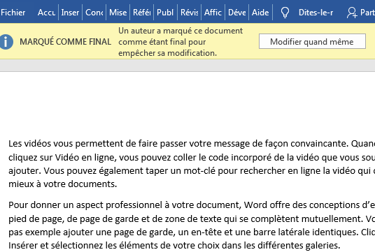 L’une des autres techniques utilisées pour protéger un document consiste à le marquer comme final ou protégé. Un document marqué comme final n’autorise pas de modifications ultérieures. Heureusement, vous pouvez facilement désactiver cette protection. Lorsque vous ouvrez ce genre de documents, vous verrez une barre en haut de la fenêtre vous indiquant que le document est marqué comme final. Cliquez sur le bouton « Modifier quand même » :