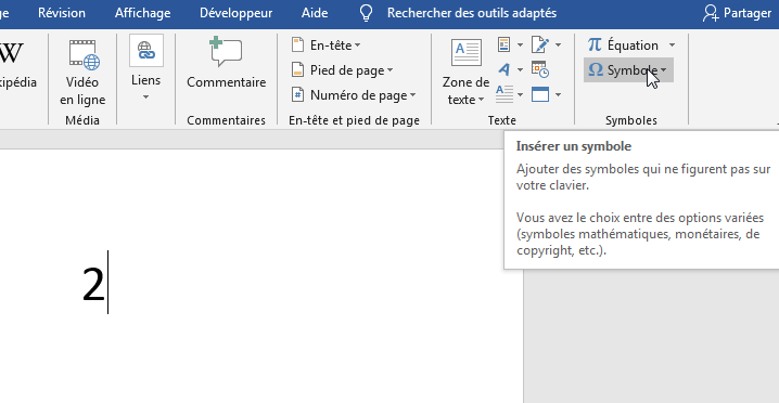 - Ensuite, dans le ruban en haut de la fenêtre Word, accédez à l’onglet « Insertion» et cliquez sur le bouton de commande « Symbole » qui se trouve dans la section « Symboles » :