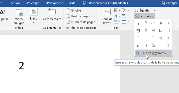 - Dans le menu déroulant qui s’affiche, vous trouverez une liste de symbole récemment utilisés. Sélectionnez la dernière option « Autres symboles » pour afficher la boîte de dialogue Symbole :