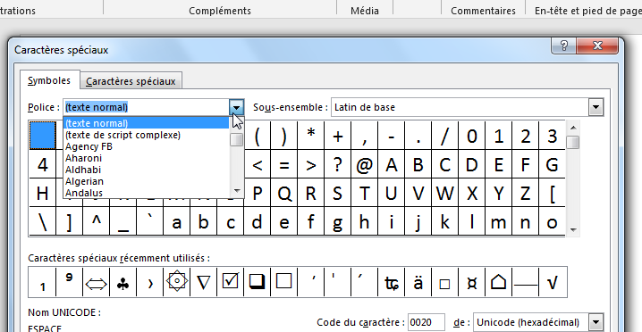 - Lorsque la boite de dialogue « Caractères spéciaux» s’ouvre, utilisez le menu déroulant « Police » pour choisir la police dans laquelle vous souhaitez afficher l'exposant. Généralement, il est très recommandé que vous ajoutiez l'exposant dans la même police que celle dans le reste du texte. Pour cela, gardez le paramètre « (texte normal) » dans la liste déroulante. Si par contre, vous souhaitez insérer l'exposant en utilisant une police différente, ouvrez la liste déroulante « police » et sélectionnez la police souhaitée parmi celles proposées :