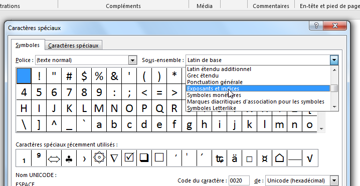 - Pour faciliter la recherche, vous pouvez sélectionner l'une de deux options « Supplément Latin-1» ou « Exposants et indices » dans le menu déroulant « Sous-ensemble » :