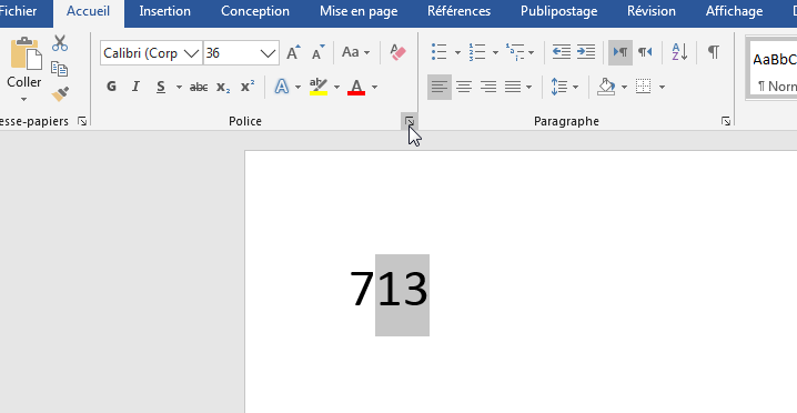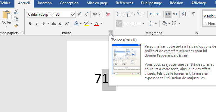 - Une fois le nombre ou le texte sélectionné, ouvrez la boîte de dialogue « Police». Vous pouvez le faire en appuyant sur le raccourci clavier « Ctrl + D » ou en cliquant sur le petit bouton fléché dans le coin inférieur droit de la section « Police » dans l’onglet « Accueil » comme illustré dans la capture ci-dessous :