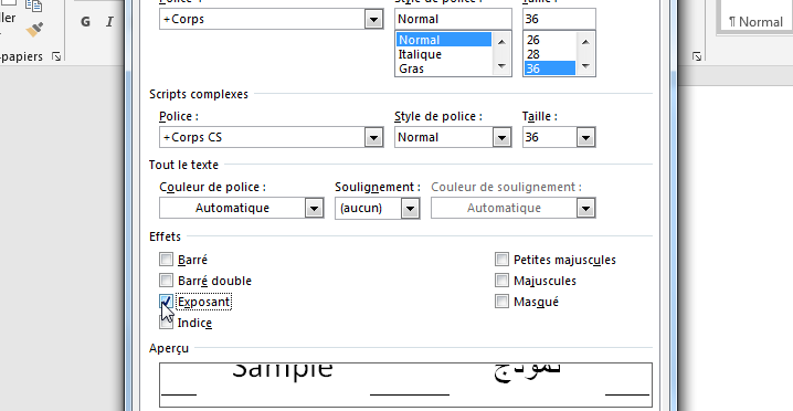 - Une fois la boite de dialogue « Police» ouverte, cochez la case en regard de « Exposant » dans la section « Effets ». Vous pouvez voir un aperçu du résultat dans la zone « Aperçu » :