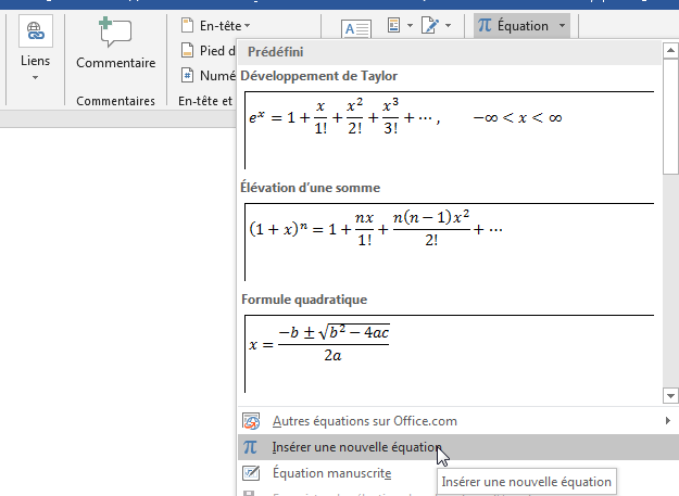 - Tout en bas du menu déroulant qui s’affiche, sélectionnez l'option « insérer une nouvelle équation» :