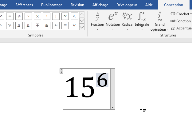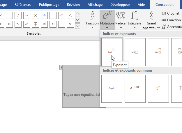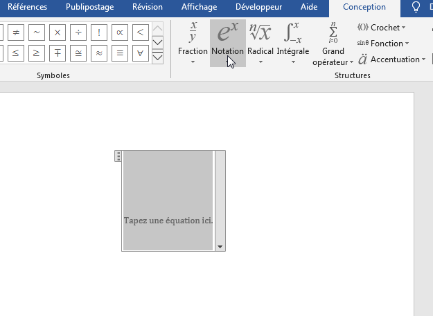 - Dans l'onglet contextuel « Conception», sélectionnez l'option « Notation » qui apparait sous forme d’un bouton avec un « e » élevé à la puissance « x » dans le groupe « Structures ».