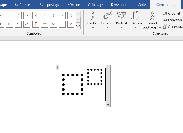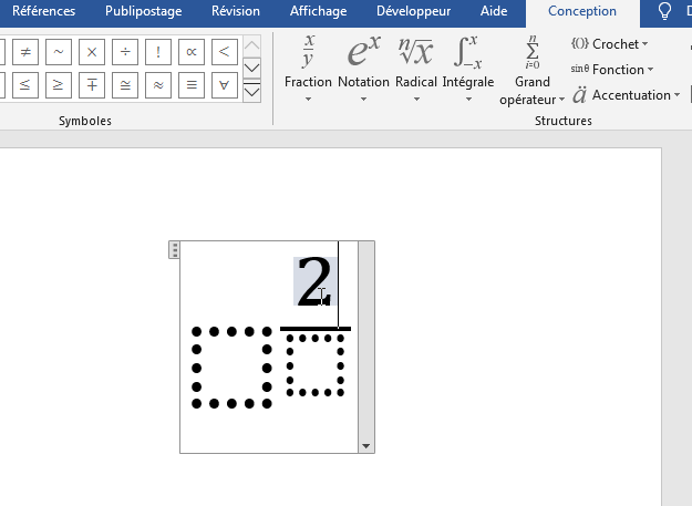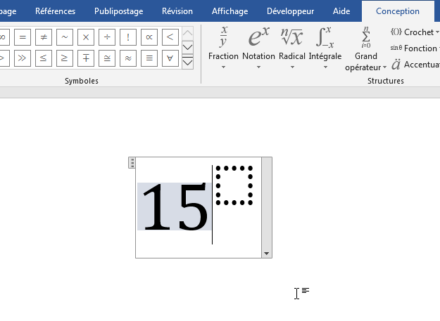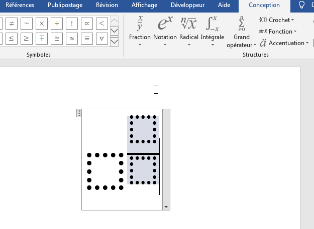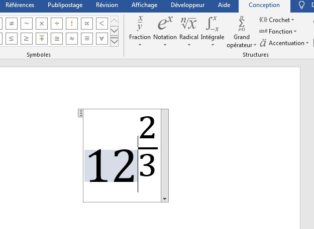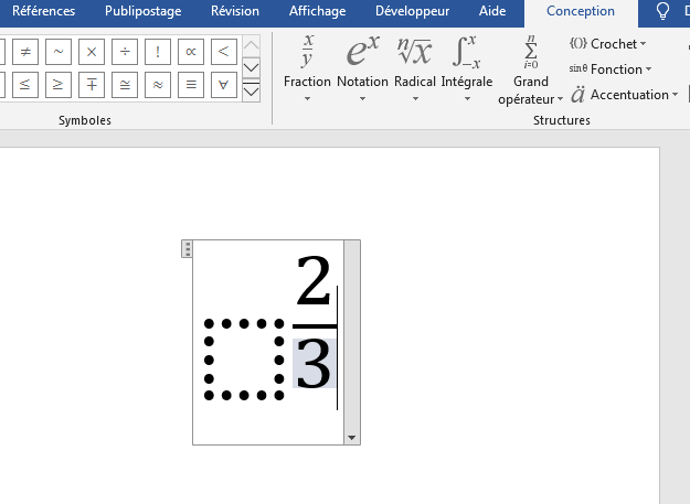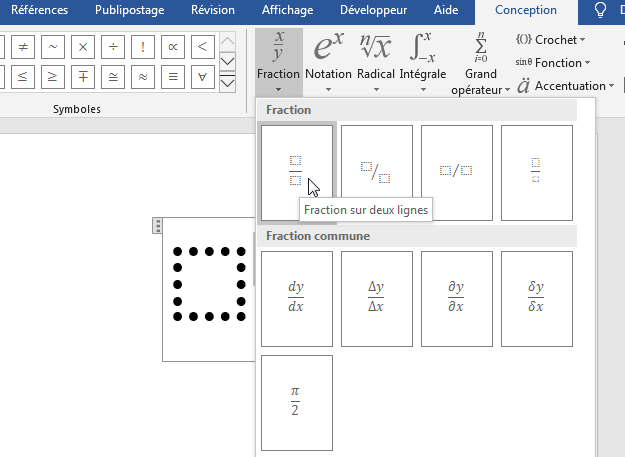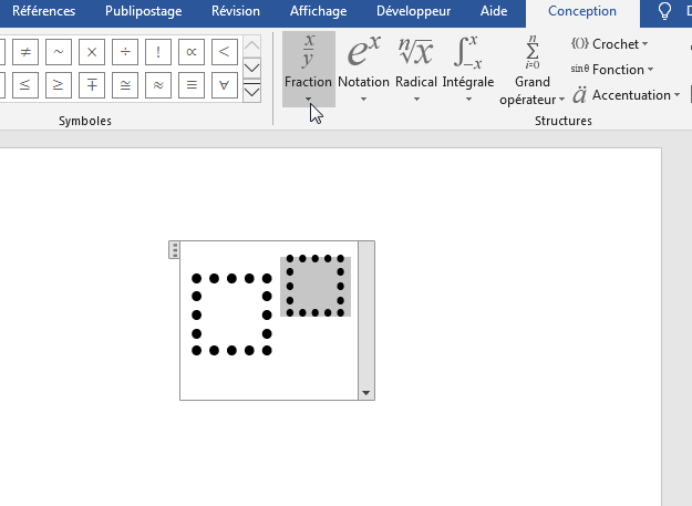 - Cliquez sur la petite case en haut à droite et puis cliquez sur le menu déroulant « Fraction» dans le groupe « Structures » toujours dans l’onglet « Conception » :