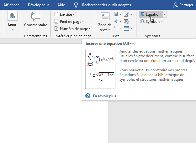 - Accédez à l'onglet « Insertion» et faites un double-clic sur le bouton de commande « Equation » dans le groupe « Symboles » :