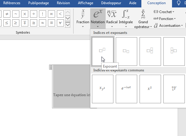 - Lorsque vous cliquez dessus, un menu déroulant s’affiche avec deux en-têtes : « indices et exposants» et « indices et exposants communs » :
