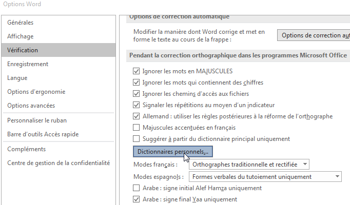 - Cliquez sur le bouton de commande « Dictionnaires personnels » :
