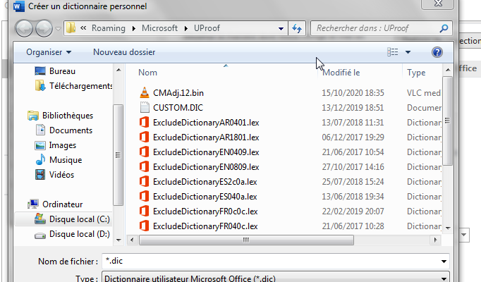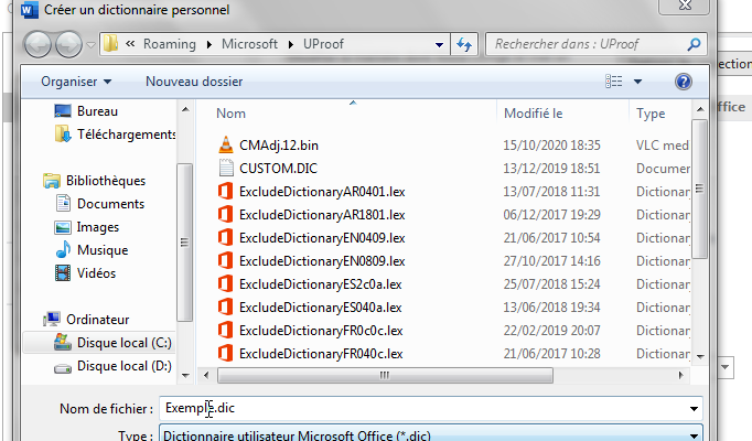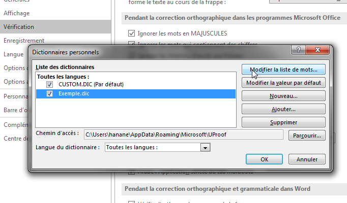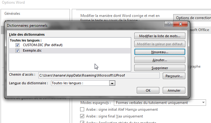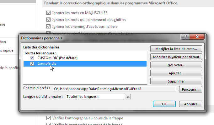 Remarque : par défaut, Word enregistre chaque nouveau dictionnaire personnalisé dans le dossier « UProof » qui est connecté à votre nom d'utilisateur. En effet, vous pouvez vous seul accéder à ce dictionnaire. Au contraire, si vous avez besoin de partager votre nouveau dictionnaire, vous devez l’enregistrer dans un autre dossier accessible par d'autres utilisateurs Word de votre organisation.