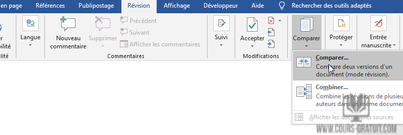 - Cliquez ensuite sur le bouton « Comparer » dans le groupe de boutons « Comparer » de l'onglet « Révision » du ruban.