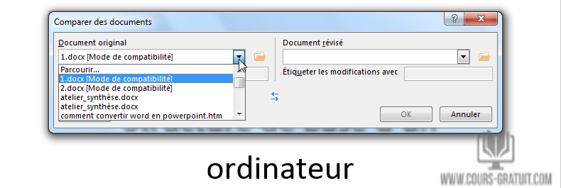- Vous pouvez également utiliser le bouton « Ouvrir » ou la commande « Parcourir… » avec le menu déroulant « Document révisé » si vous avez oublié d'ouvrir le document révisé avant d'ouvrir la boîte de dialogue « Comparaison de documents ».