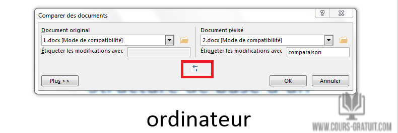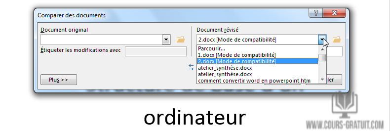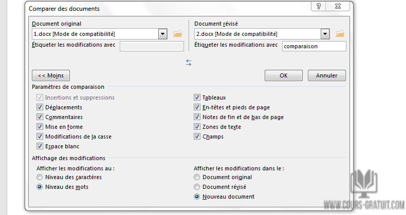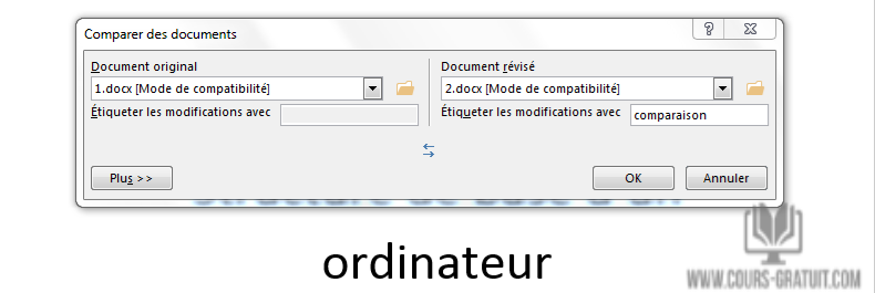 - Pour afficher toutes les options de comparaison de documents au bas de la boîte de dialogue, cliquez sur le bouton « Plus >> ».