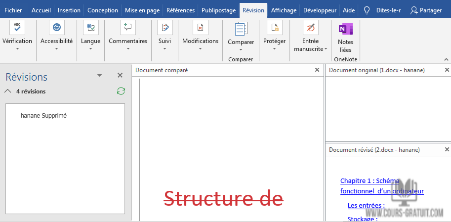 - Word ouvrira un nouveau document qui affichera le texte de la version révisée de votre document et mettra en évidence les modifications apportées à la version révisée du document. Vous pouvez enregistrer ce document dans un fichier séparé si vous le souhaitez. Cette comparaison n’ajoute aucun changement dans les documents source. Regarder par-dessus ! Parcourez les modifications apportées à votre document par des tiers : Le défilement est synchronisé entre les trois documents : original, modifié et comparé. Cliquez sur une modification dans le volet « Révision » (affiché à gauche) pour voir rapidement quelle partie de votre document a été pliée, fusionnée ou mutilée.