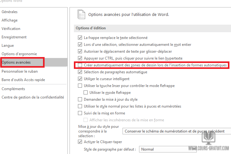 - Dans la section « Options d'édition », décochez les options « Créer automatiquement des zones de dessin lors de l'insertion de formes automatiques ». (Dans Word 2003, cela se trouve dans la section Options générales.)