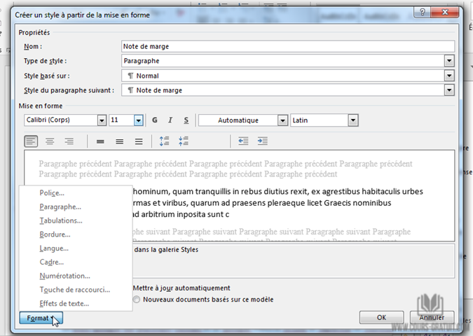 Dans la boîte de dialogue « Nouveau style » ou « Créer un nouveau style à partir de la mise en forme », saisissez un nom pour votre style et utilisez les commandes de la boîte de dialogue et le menu Format pour définir la mise en forme de la police et des paragraphes. Vous n’êtes pas obligé de l’obtenir parfait maintenant; vous pouvez toujours le régler plus tard.