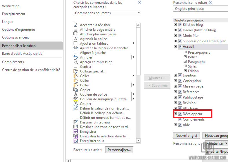 Cliquez avec le bouton droit sur le ruban et choisissez « Personnaliser » le ruban. Dans l’onglet « Personnaliser le ruban » de la boîte de dialogue « Options Word », cochez la case « Développeur » sous « Onglets principaux », puis cliquez sur « OK ».