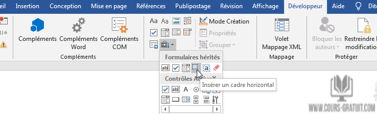 Une fois que vous avez activé l'onglet Développeur, sélectionnez-le dans le ruban Word. Dans le groupe « Contrôles », à gauche du séparateur, le bouton en bas à droite concerne les « outils hérités ». Ce bouton ouvre une palette qui inclut les outils « Formulaires hérités », notamment le bouton « Insérer un cadre horizontale ».