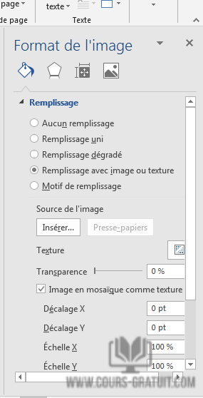 - Une boîte « Format d'image » s'ouvrira. Assurez-vous que « Remplissage » est sélectionné, puis sélectionnez « Remplissage avec image ou texture » :