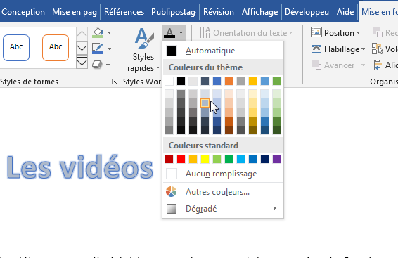 Ne vous inquiétez pas si le style Word Art que vous avez choisi n'est pas dans la couleur que vous souhaitez. Vous pouvez facilement ajuster cela en sélectionnant le texte et en cliquant sur une nouvelle couleur pour remplir le texte dans le menu « Remplissage du texte » que vous trouverez dans le groupe « Styles WordArt » de l’onglet « Mise en forme ».