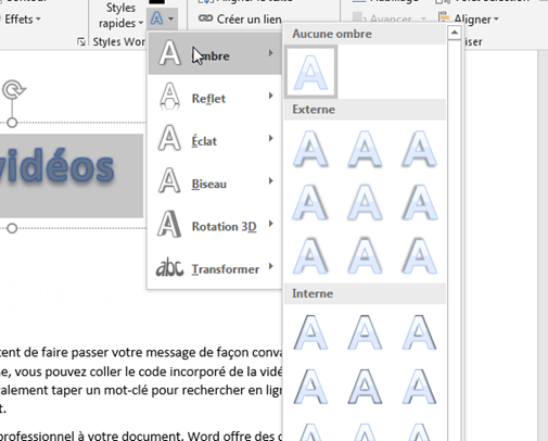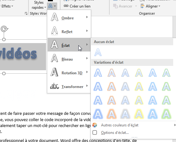 Vous avez également la possibilité d’ajouter des effets de texte Word Art. Cela vous permettra d'appliquer des effets visuels à des lettres individuelles, des mots ou des phrases. Vous pouvez accéder à ces options en cliquant sur le bouton « Effets » dans le groupe « Styles WordArt » :