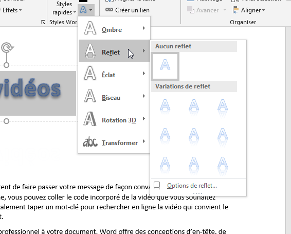 - Réflexion : choisissez cette option pour accéder à plusieurs variations de réflexion, de faible à sombre. Pour plus d’option sélectionnez « Options de reflet » :