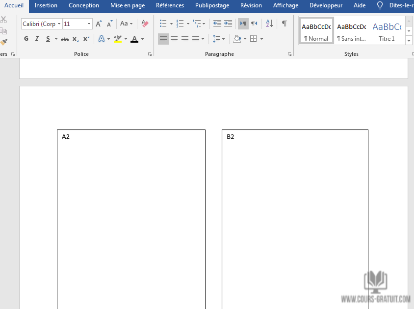 - Dessinez ensuite deux zones de texte sur la première page, une à gauche et une à droite. Ici, nous les nommons simplement A1 et B1.